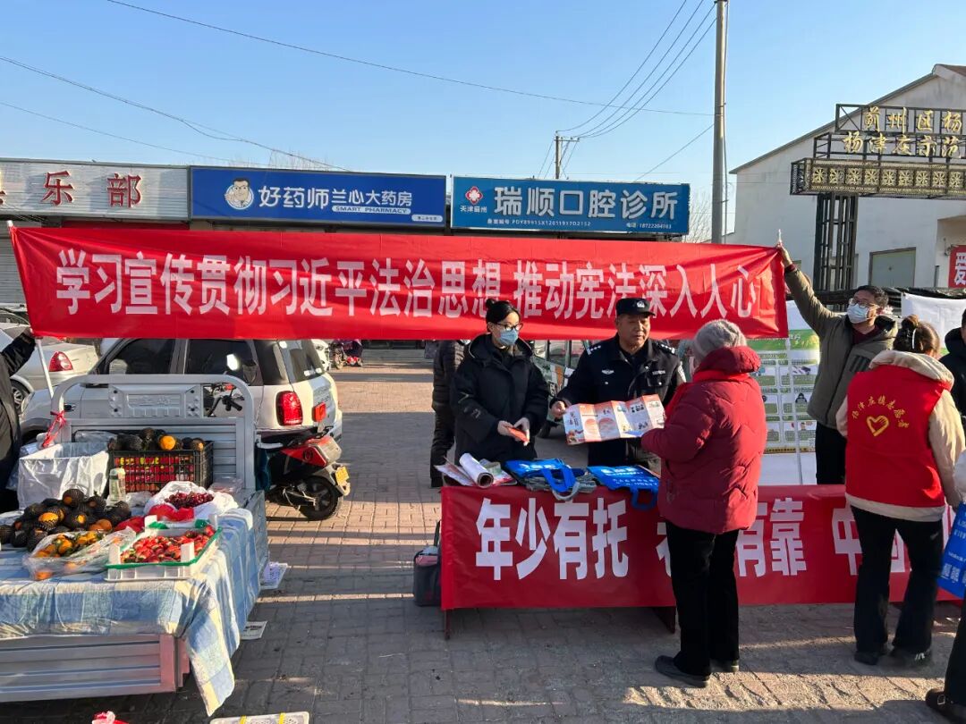 为将法治精神更接地气,让宪法知识延伸到基层末梢,在第十二个国家宪法日和第八个宪法宣传周到来之际,12月5日,杨津庄镇联合天津市渔山强制隔离戒毒所,借助杨津庄村集市人流密集的有利时机,共同开展了以 “学习宣传贯彻习近平法治思想,推动宪法深入人心” 为主题的综合宣传活动,多部门协同发力,为群众送上全方位的政策与法治服务。