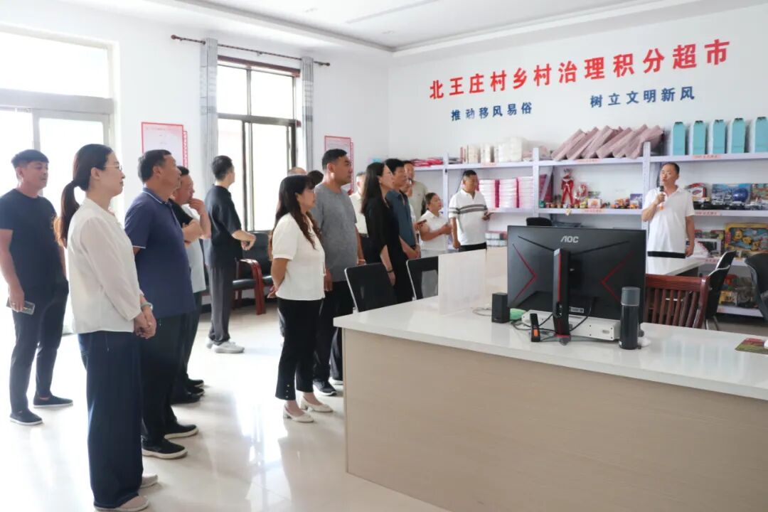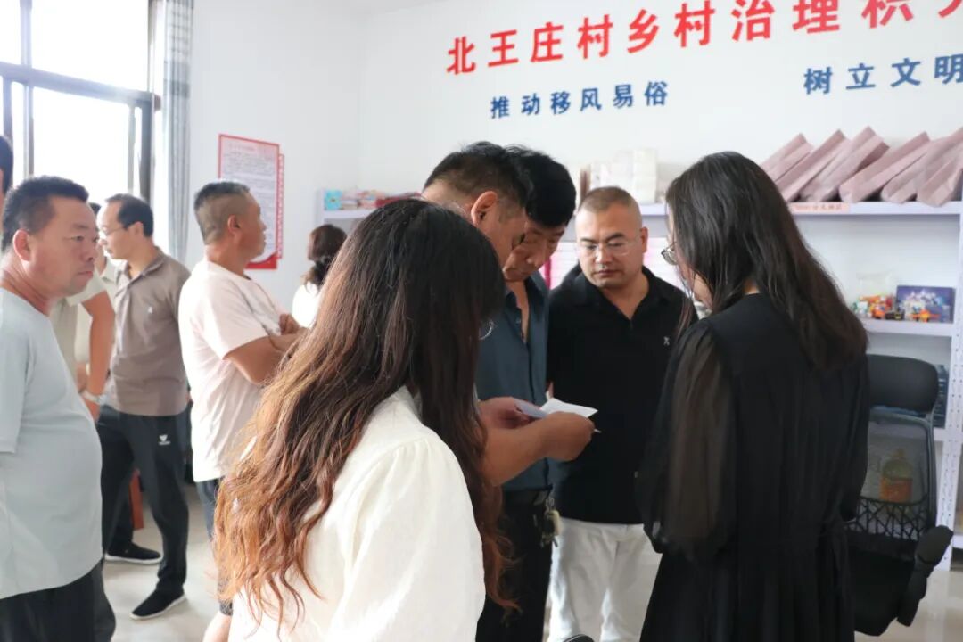 观摩组走进上仓镇北王庄村,沿着整洁的村道,近距离感受该村“抓党建、强治理、促和谐、创文明”的工作思路以及移风易俗带来的新气象。在村文化广场,醒目的村规民约、移风易俗文化墙,将婚事新办、丧事简办等理念以生动形式展现,吸引村书记们纷纷驻足观看、拍照记录。在北王庄村支委的带领下,大家走进红白喜事会客厅、乡村治理积分超市,红白理事会章程、工作流程,移风易俗“十提倡 十不准”,红白喜事“瘦身”菜单,乡村治理积分制考核清单,“孝廉北王”先锋榜等内容张贴在醒目位置,大家边看边学边问,不时就具体问题与示范村工作人员深入交流。通过实地观摩,村书记们深入学习了北王庄村“红白理事会+积分制”的管理模式和推动移风易俗的先进经验做法。