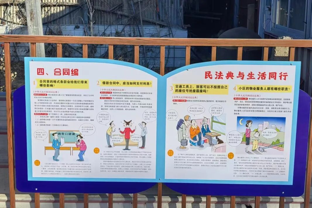 长廊第二个展区以“民法典与生活同行”为主题,清晰地标注了“民法典共7编1260条,涵盖了从出生到死亡的所有民事法律关系。”展板以知识问答方式紧扣“胎儿能够继承遗产吗?”“法律保护网络虚拟财产吗?”“因见义勇为而受伤的,由谁承担民事责任?”等贴近村民生活的问题进行阐释。