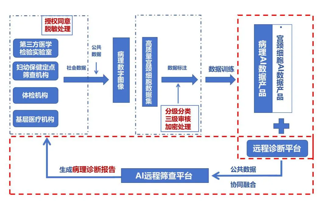 三是实现病理数据流通,服务远程诊断。通过数据流通赋能远程会诊,连接基层与三甲医院支持实时诊断,推动优质资源下沉。已在全国建立15个市级筛查实验室,覆盖两癌筛查等场景,入选工信部人工智能医疗器械创新任务揭榜项目,成为首个规模化应用于宫颈癌筛查的智慧病理解决方案。