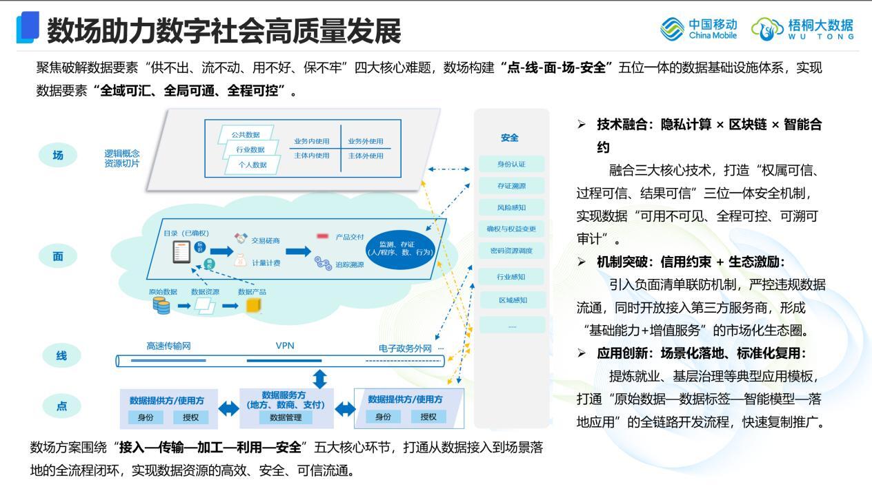 中国移动通信集团等单位从点、线、面、场、安全五个维度构建数场基础设施。通过接入点实现数据主体进入;通过高速数据传输网,实现各主体之间的网络互通;打造业务节点、功能节点实现数据流通利用技术面;做好数据应用、场景化创新;做好内生性的安全覆盖点、线、面、场的动态全流程的保护措施。在浙江、山东、贵州等地,使用数场基础设施,融合人社数据、公开数据、运营商数据,实现新就业形态群体的精准识别,将识别准确率提升至80%以上; 在不泄露原始数据的前提下,更精准清晰的构建区域巡防监管态势地图,在夜间治安巡区识别、涉赌区域识别、涉黄区域识别三个场景,应用后各场景发案数同比降低8%以上。