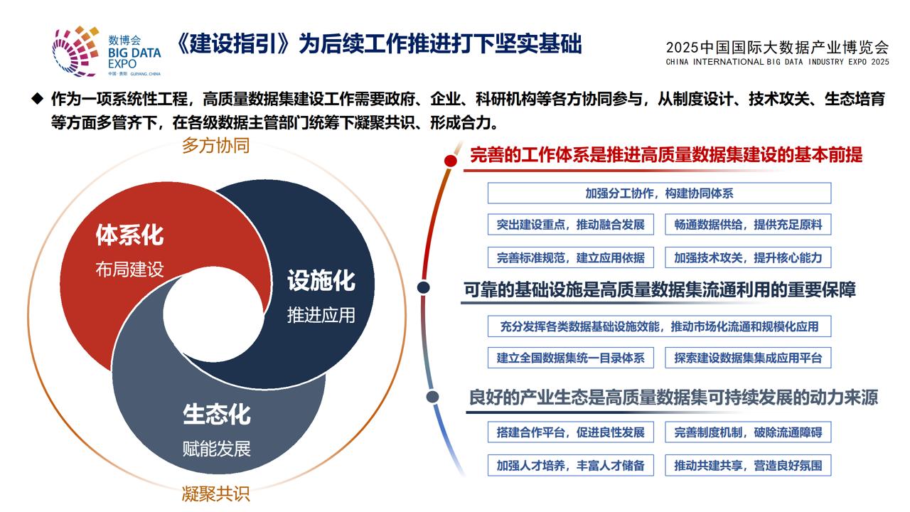 《建设指引》指出要以体系化思维优化高质量数据集建设布局,以设施化手段促进高质量数据集流通利用,以生态化环境保障高质量数据集可持续发展,构建覆盖全流程、贯通各环节的高质量数据集建设格局。