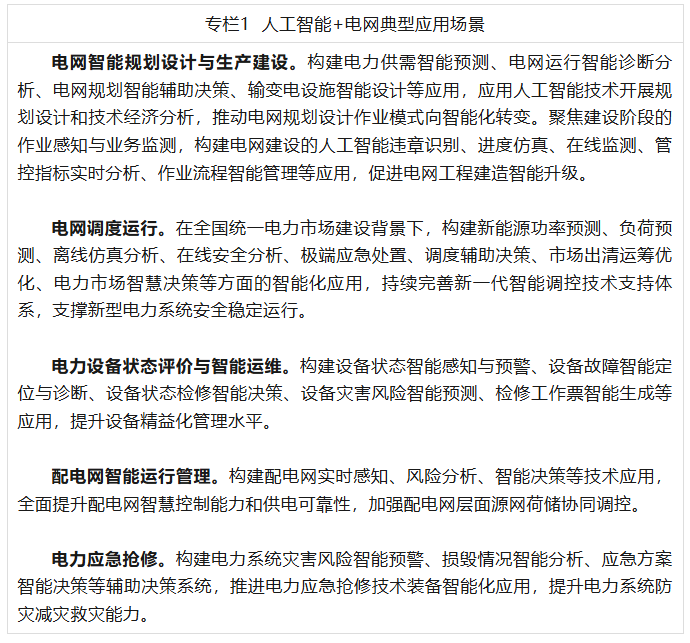 (一)人工智能+电网。围绕新型电力系统下的电网安全、新能源消纳、运行效率等要求,开展电力供需预测、电网智能诊断分析、规划方案智能生成等电网规划设计应用,加强电网工程智慧建设管理;推进电网多尺度智能仿真分析,探索人工智能模型在电网智能辅助决策和调度控制方面的应用,提升电力系统源网荷储全要素安全可靠低碳运行水平;稳步提高输变电等关键装备研制智能化水平;推动电力设备故障预测性维护,打造具备自主感知、决策、执行能力的电力设备健康管理智能体,提升设备精益化管理水平;推动营配调智能一体化应用,构建电网运营服务智能支撑体系,提升电力客户全过程智能服务水平;促进人工智能技术融入电力应急体系和能力建设,提升电力系统防灾减灾救灾智能化水平。