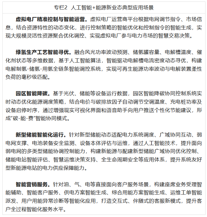 (二)人工智能+能源新业态。围绕能源保供和绿色低碳转型需求,推进人工智能技术在虚拟电厂(含负荷聚合商)、分布式储能、电动汽车车网互动等灵活性调节资源中的应用,提升负荷侧群控优化和动态响应能力;加强人工智能技术在新型储能与电力系统协同优化调度以及全生命周期安全中的应用,推动可再生能源制氢生产工艺智能寻优。强化人工智能技术赋能能源生产过程中的节能和碳排放管理,提升多能互补综合能源系统电、热、冷、气联供的综合能效和降碳水平。推动人工智能在零碳园区、智能微电网、算电协同中的应用,提升源网荷储一体化智能运行水平,促进新能源就地消纳。