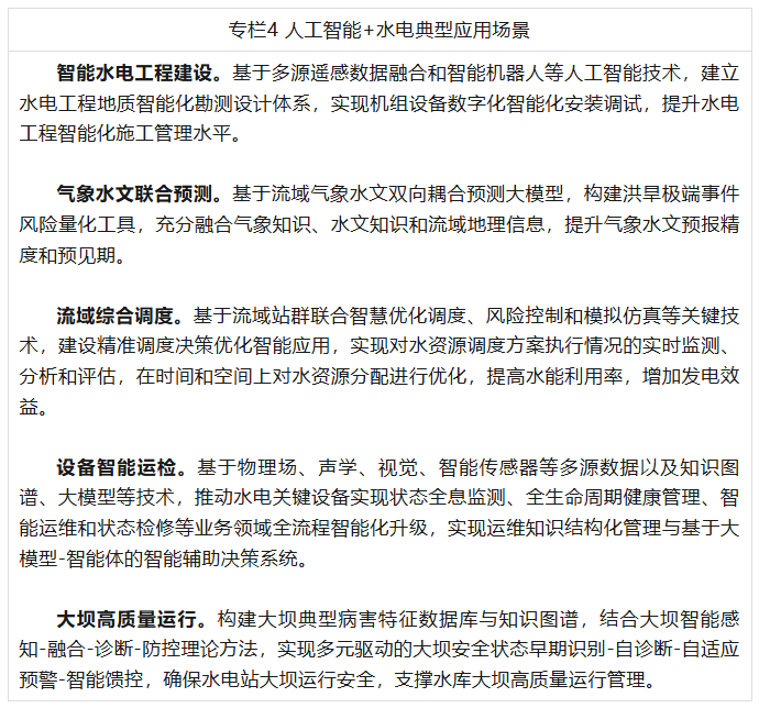 (四)人工智能+水电。聚焦高海拔高寒地区水电工程智能化建设与流域水电站群智慧调度运营,推进人工智能技术在水电工程建设中的应用,提升水电工程智能化设计施工管理水平;推进人工智能技术与传统水文模型、气象模型、大规模水库调度技术融合,提升气象、水文双向耦合预测精度,开展调度决策优化智能应用建设;推动知识图谱、大模型、智能体等技术融入新一代水电智慧运营大脑,在水电站智慧运维与精益检修、智能大坝态势感知与智慧管理等重点领域形成智能化解决方案。