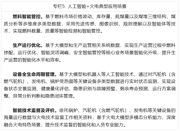 (五)人工智能+火电。围绕火电清洁降碳、安全可靠、高效调节、智能运行的发展方向,在燃料管控、生产运行优化与智能控制、设备全生命周期管理等业务场景,协同开展人工智能赋能及技术创新。加快火电数字化设计建造和智能化升级,推动火电运行控制系统智能化发展和应用,提升火电关键装备全生命周期智能监测及健康管理能力,助力火电支撑保障能力进一步提升。