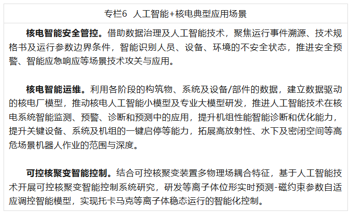 (六)人工智能+核电。围绕核电安全发展,构建核电安全预警、电站运行事件智能溯源分析、应急响应的智能辅助支持系统,开展核工业特种运维机器人技术攻关,持续推动核电系统的自动启停等技术升级演进,探索人工智能技术助力离子体预测控制、可控核聚变等技术路径,推动核电行业向数据驱动、模型牵引、智能管控的新模式稳步转型。