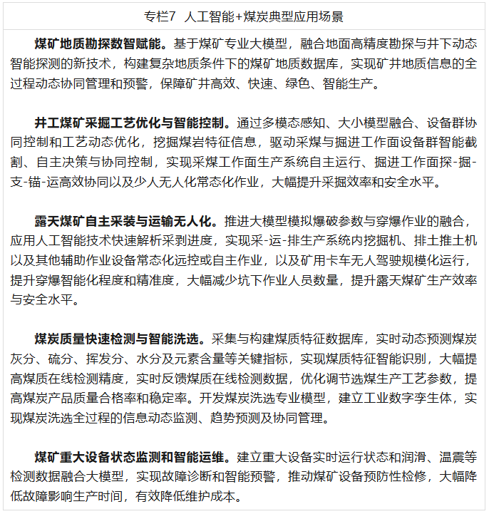 (七)人工智能+煤炭。聚焦地质勘探、煤矿采掘(剥)、煤炭洗选、生产调度、安全管控、设备管理等典型场景,稳定获取复杂地质、多工况以及多时空协同条件下的各种工况数据,融合应用智能模型,实现生产过程智能控制与自主决策,助力少人无人化作业常态化运行,稳步推进减人、增安、提效,进一步夯实煤炭在能源安全中的兜底保障作用。