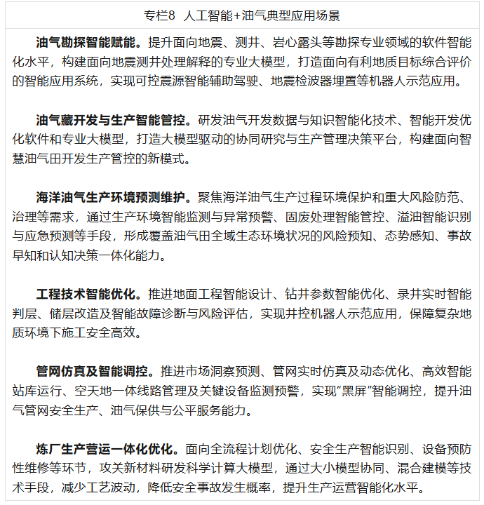 (八)人工智能+油气。聚焦跨专业协同研究、现场作业操控、生产运行管控等方向,推动勘探地质目标智能评价、开发方案智能优化、钻井压裂等作业参数智能调整、炼化装置智能运行、管网运行实时仿真,加快智能钻机、机器人、无人机、智能感知系统等智能生产技术装备的研发与应用,推动生产现场等全过程智能联动与自动优化,推动油气产业链智能化升级建设。