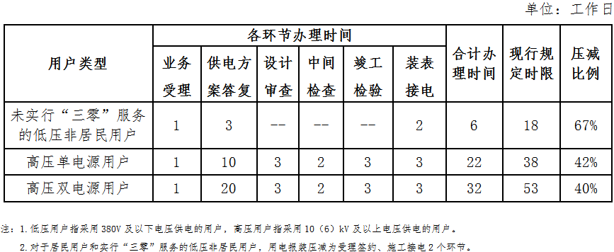 ——办电更省时。2020年底前,将低压、20kV及以下高压电力接入工程审批时间分别压减至5个、10个工作日以内;将供电企业办理用电报装业务各环节合计时间在现行规定基础上压缩40%以上(详见附件2),未实行“三零”服务的低压非居民用户、高压单电源用户、高压双电源用户的合计办理时间分别压减至6个、22个、32个工作日以内;将居民用户、实行“三零”服务的低压非居民用户从报装申请到装表接电的全过程办电时间分别压减至5个、25个工作日以内。2021年、2022年底前,将实行“三零”服务的低压非居民用户全过程办电时间进一步分别压减至20个、15个工作日以内。