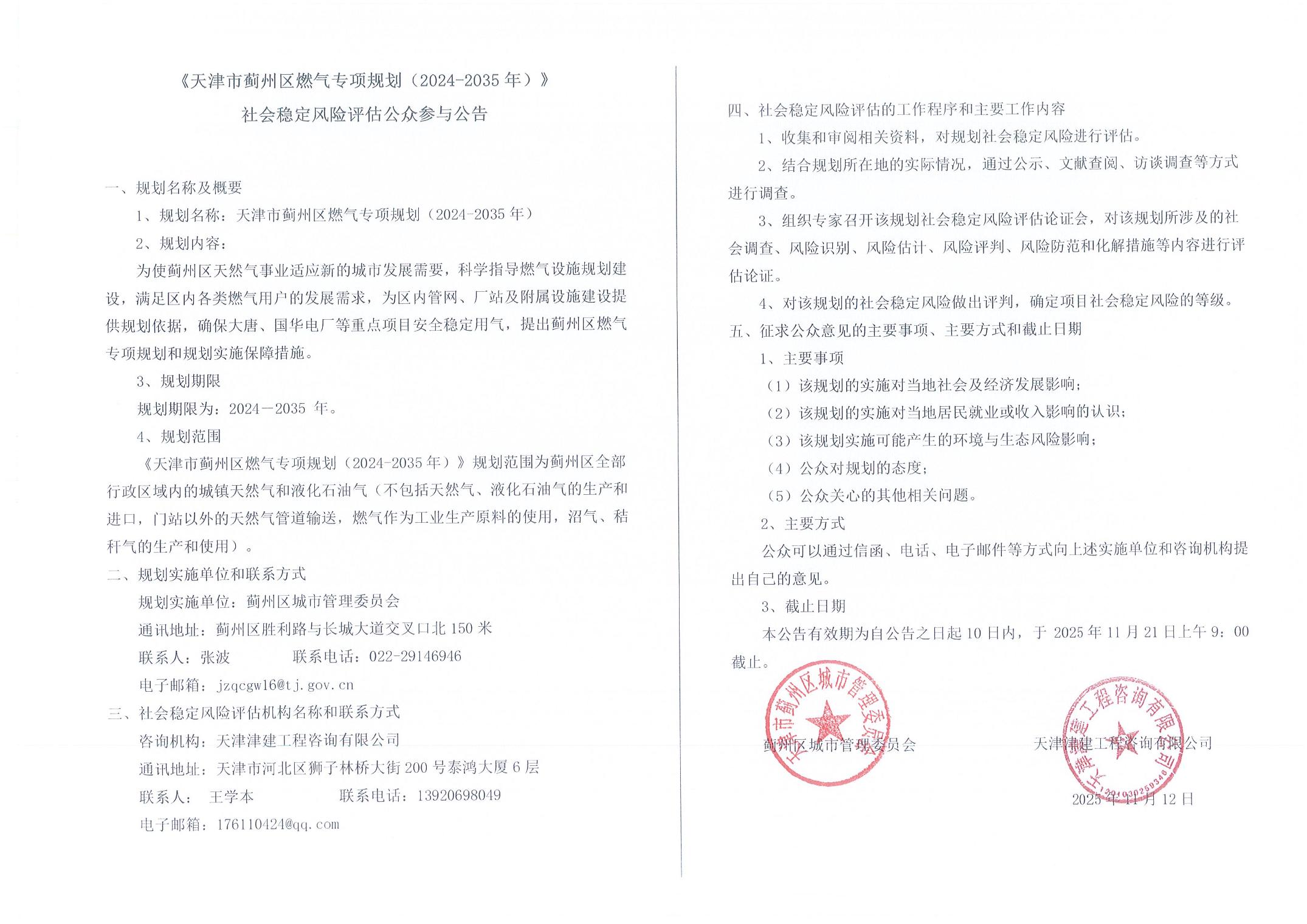 天津市蓟州区燃气专项规划(2024-2035年)社会稳定风险评估公众参与公告