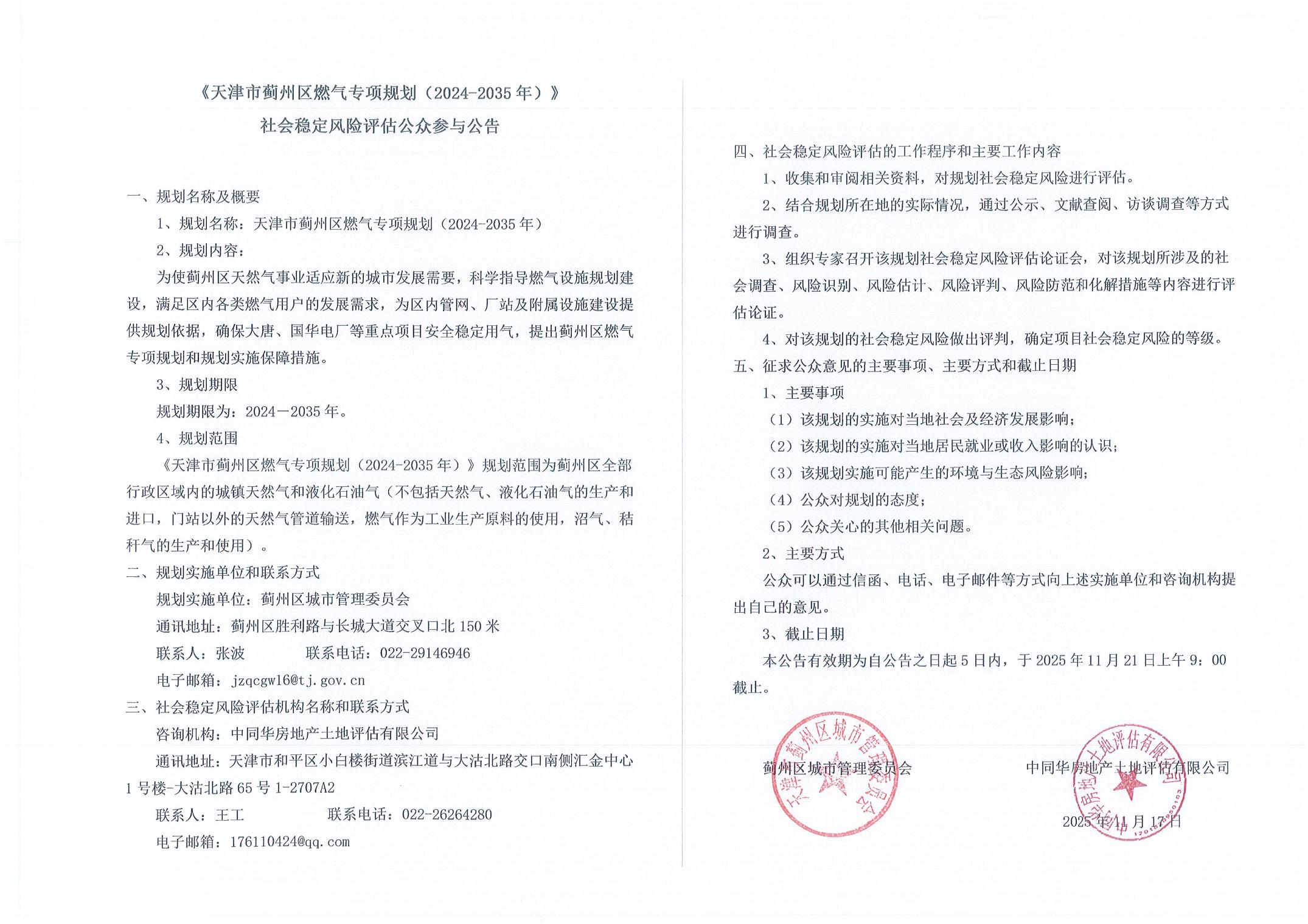 天津市蓟州区燃气专项规划(2024-2035年)社会稳定风险评估公众参与公告