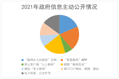 2021年,全区通过“蓟州区人民政府”官网、“智慧蓟州”APP、政务微博和微信、电子屏幕、公告栏等多种渠道和形式主动公开各类信息约3.5万件/次,其中通过“蓟州区人民政府”官网公开各类政府信息6855件(“政府信息公开”专栏公开政府信息4650余件)、“智慧蓟州”APP公开政府信息7500余条、津云客户端—“云上蓟州”公开政府信息2400余条、政务微博—“蓟州发布”公开政府信息7040余条、政务微信—“掌上蓟州”公开政府信息3610余条。同时,在规定时间内完成了2020年蓟州区政府信息公开年度报告编制及公布工作。