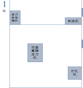 事故车间位于金福兴刀剪厂西南角厢房内,长13.4米、宽6米,外墙为砖混结构,东侧有木质框玻璃窗,南北有一1.2米砖体隔断,北侧隔间进门左侧一台热熔机、西侧一台弯箍机,南侧隔间中间位置一台双盘摩擦压力机、东南角一台打孔机。(见图1)