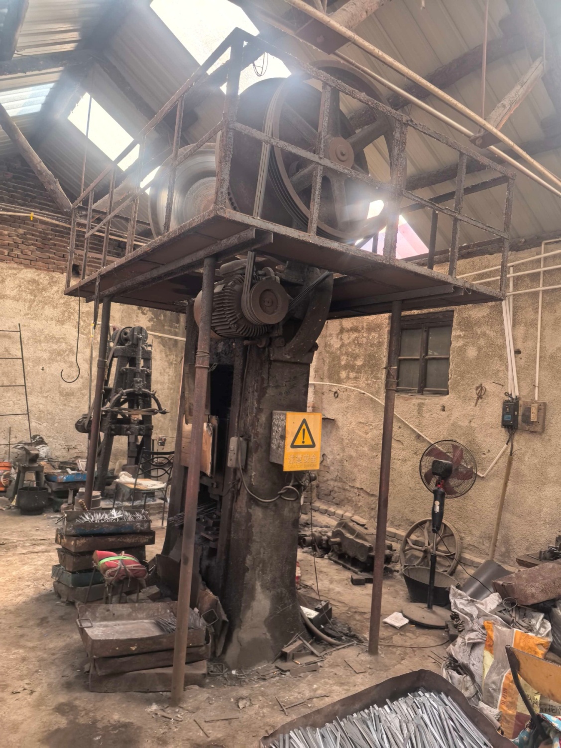 事故设备为朱某深2007年购买的二手双盘摩擦压力机,甘肃省轻工机械厂1979年9月制造,型号为J53-160A,公称压力160吨,滑块行程360毫米。设备高约3.3米、宽1.25米、厚0.45米。