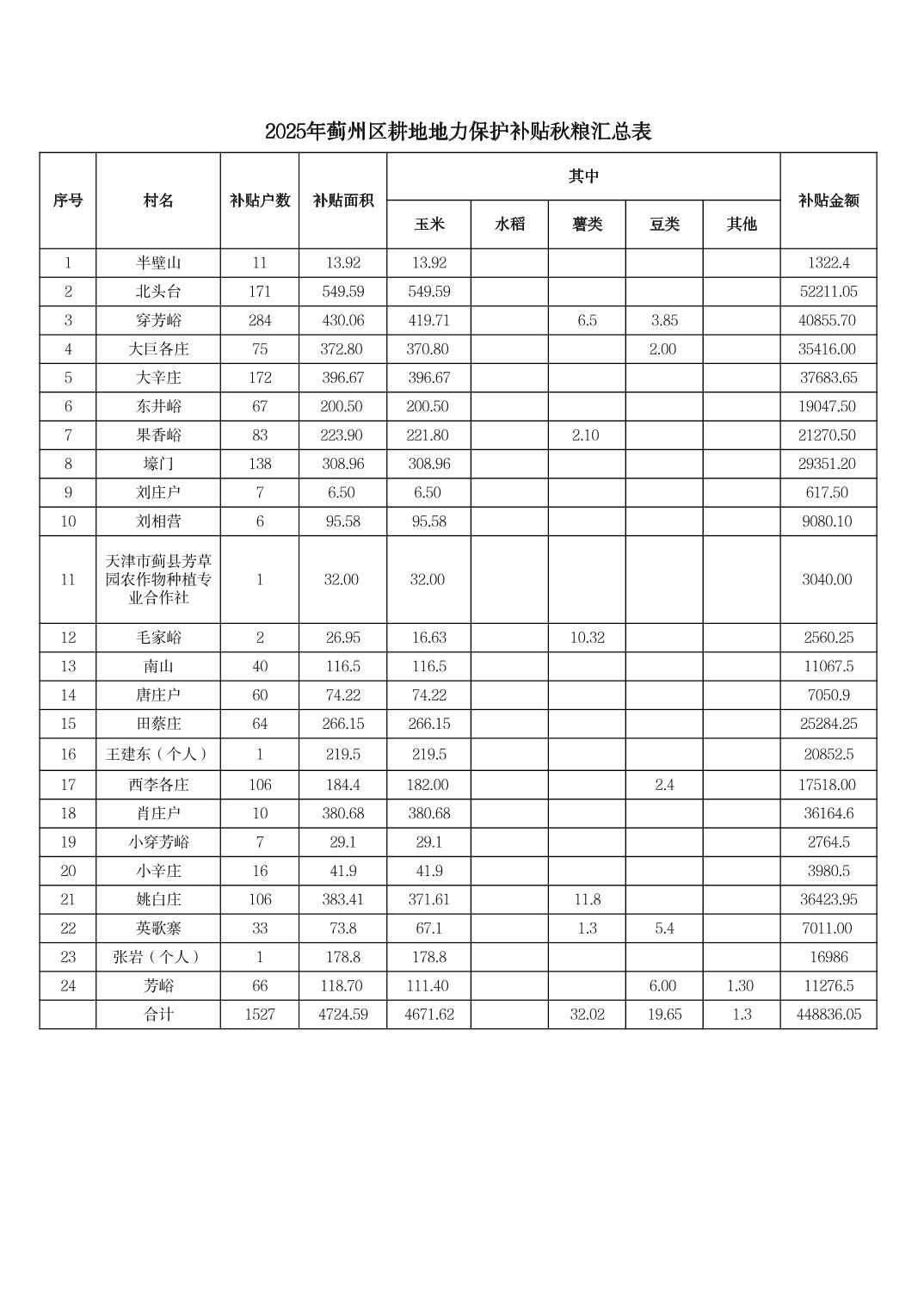 2025年蓟州区穿芳峪镇耕地地力保护补贴秋粮汇总表