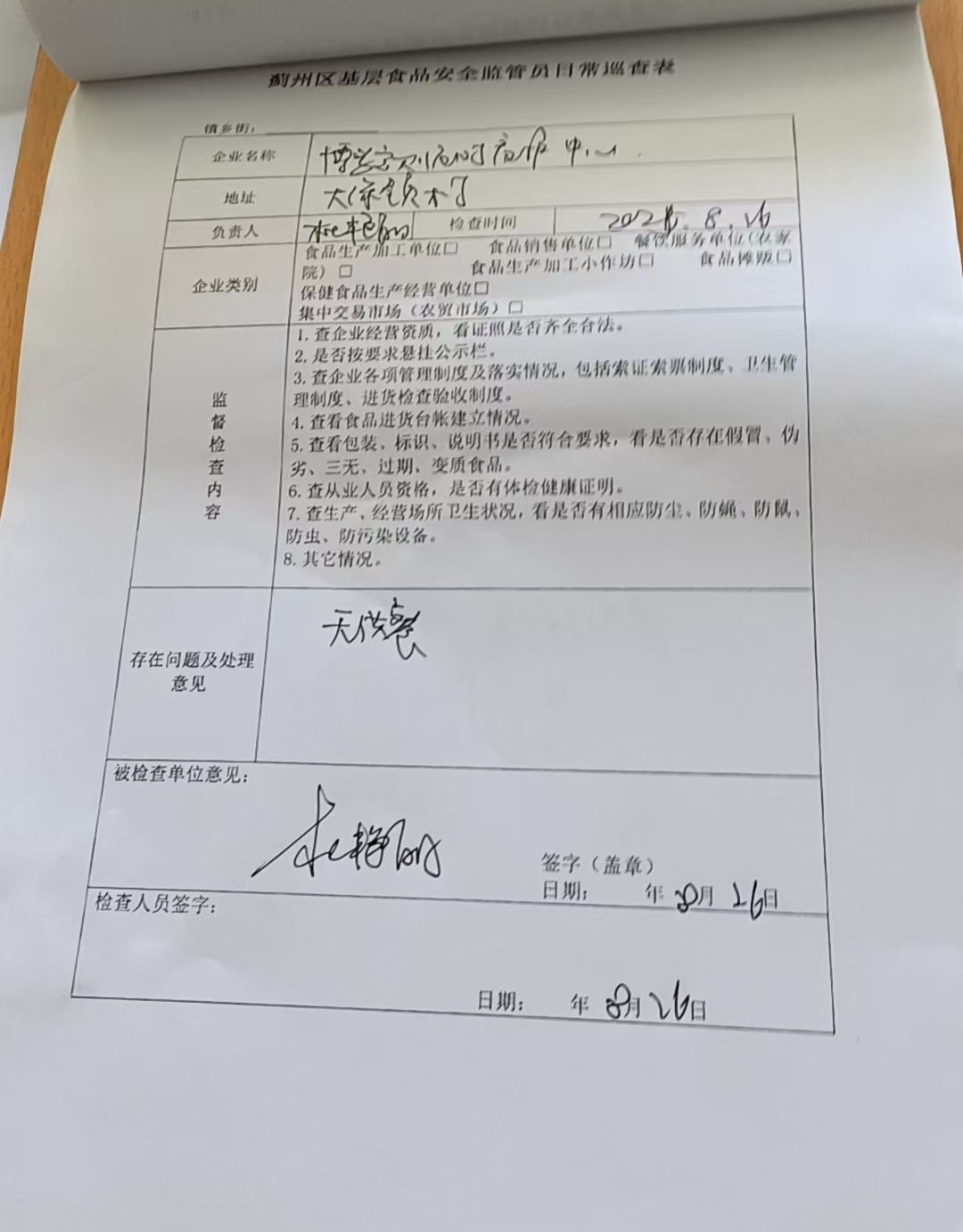 2025年8月26日,为确保本镇百姓的食品药品饮食安全,镇食安办安排基层食药品安全监管员,对镇域学校、托管点进行全面检查。检查结果显示部分存在问题,安全监管员责令其立即整改。