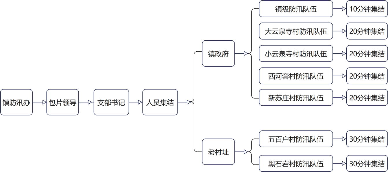 各应急队伍接到镇防汛办的通知后,通知各村包片领导,由包片领导通知支部书记,由支部书记通知相关人员到指定地点集结。镇级防汛队伍成员、大云泉寺村防汛队伍、小云泉寺村防汛队伍、西河套村防汛队伍、新苏庄村防汛队伍在州河湾镇政府院内集结,镇级防汛队伍集结时间为10分钟,村级集结时间为20分钟;五百户村防汛队伍、黑石岩村防汛队伍在州河湾镇护林防火队院内集结,集结时间为30分钟。